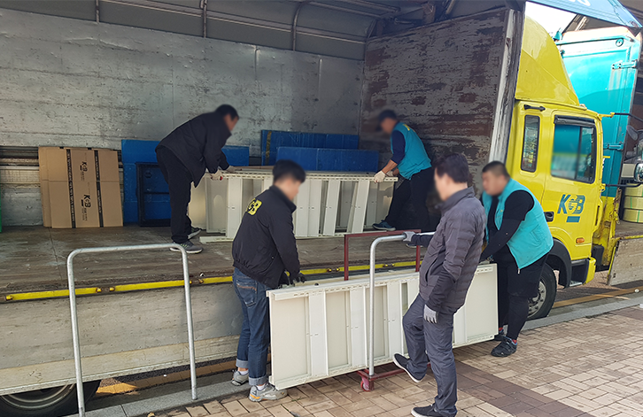 • 실내 반입시 업체 직원이 각 부서의 위치까지 운반을 하면 각 부서 직원은 본인 물건을 신속하게 정리하고, 안내표에 따라 물량을 유도해야 합니다.